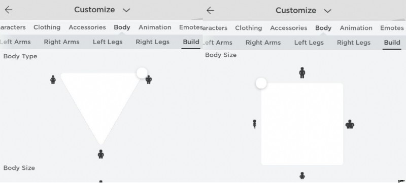 アバターのカスタマイズ ページのビルド セクションで、アバターのスケールを R6 から R15 に切り替えることができます。これにより、アバターのよりカスタマイズ可能なパーツのロックが解除されます。これには、体のサイズとタイプを微調整してスレンダーマンの外観を実現する機能が含まれます.ポインターを逆ピラミッドの最上部に移動して、体型をできるだけ高くします。スレンダーマンは痩せているので、左上隅のボディサイズセレクター内にポインターを移動して複製することもできます.