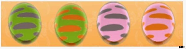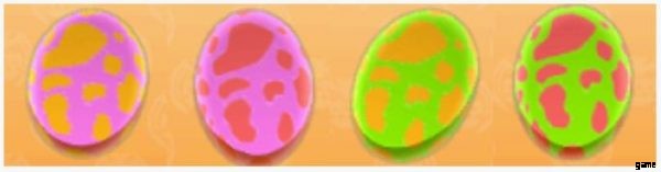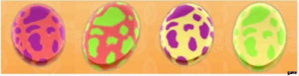 ゲンドロームの卵はバード ワイバーン クラスに分類されるため、さまざまなサイズの斑点が見られます。オレンジ/ライト パープル、ダーク ピンク/ライト パープル、オレンジ/ブライト グリーン、ダーク ピンク/ブライト グリーンの 4 つの色の組み合わせのいずれかで見つけることができます。