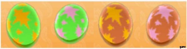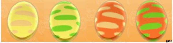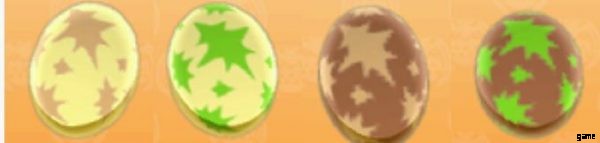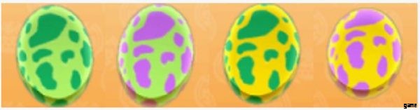 クルペコの卵のパターンには、緑/薄緑、紫/薄緑、緑/黄、紫/黄の色の組み合わせでさまざまなサイズの斑点があります。