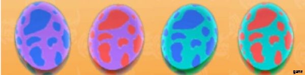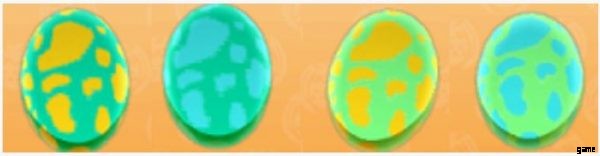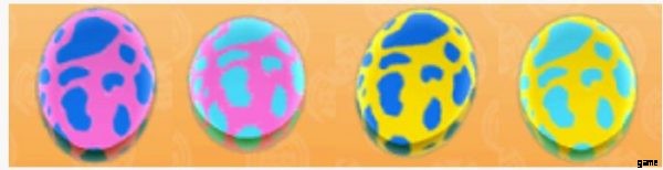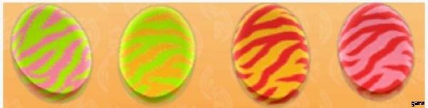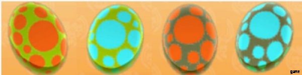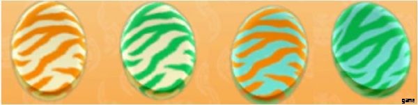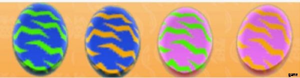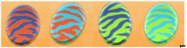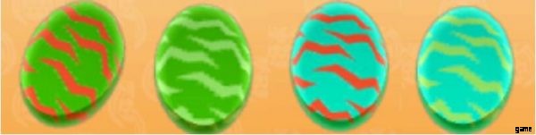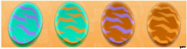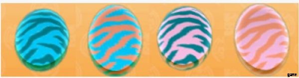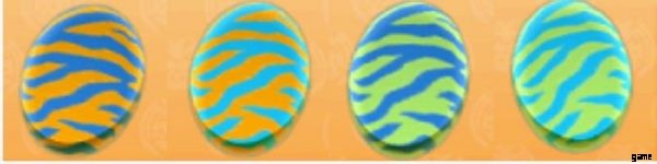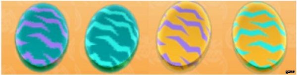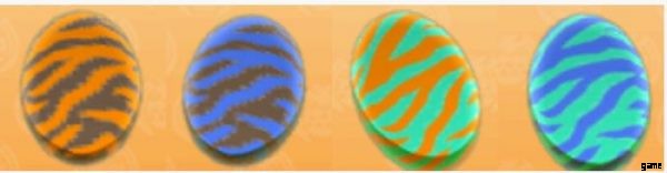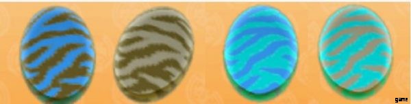 ティガレックスの卵にもトラの縞模様があります。それに加えて、これらの色の組み合わせがあります:青/オレンジ、シアン/オレンジ、青/ライト グリーン、シアン/ライト グリーン。