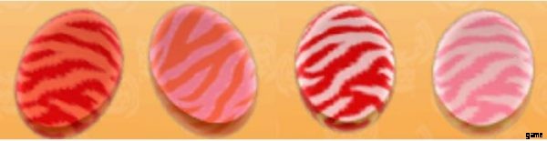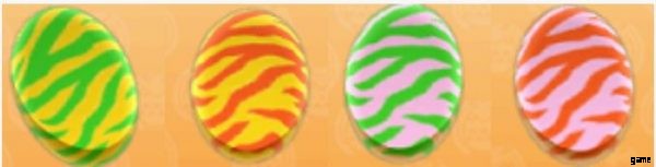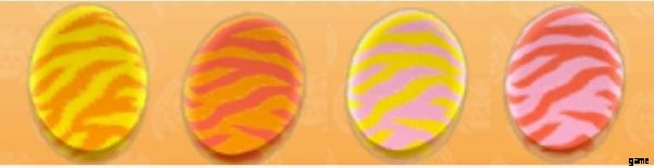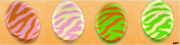 Rathian の卵はトラの縞模様です。また、ダーク オレンジ/ライト ピンク、ホワイト/ライト ピンク、ダーク オレンジ/ブライト グリーン、ホワイト/ブライト グリーンの色もあります。