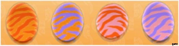 サンドバリオスの卵にもトラの縞模様があります。ただし、それらの色の組み合わせには、よりピンクがかったアンダートーンがあります:濃いピンク/オレンジ、紫/オレンジ、濃いピンク/薄いピンク、紫/薄いピンク.