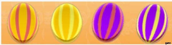 ポポの卵には、端が丸みを帯びた断片化された横縞があります。 4 つの異なる色の組み合わせがあります:パープル/シアン、イエロー/シアン、パープル/ブラウン、イエロー/ブラウン。