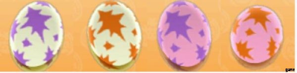 ラゴンビの卵は爆発の形をしています。また、紫/白、濃いオレンジ/白、紫/薄いピンク、オレンジ/薄いピンクの色もあります。