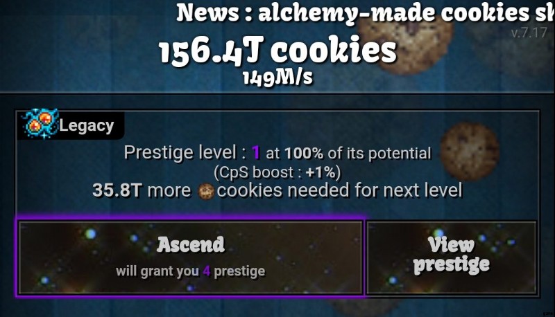 引き換えに、クッキー クリッカーを上昇させると、特別なボーナスが得られます。すべてのアップグレード、クッキー、および建物を失う可能性がありますが、プレステージ ボーナスと天国のチップから始めます。これにより、今度はより効率的に Cookie を生成できます。さらに、ヘブンリー チップが多いため、最初からより多くのアップグレードを購入できます。