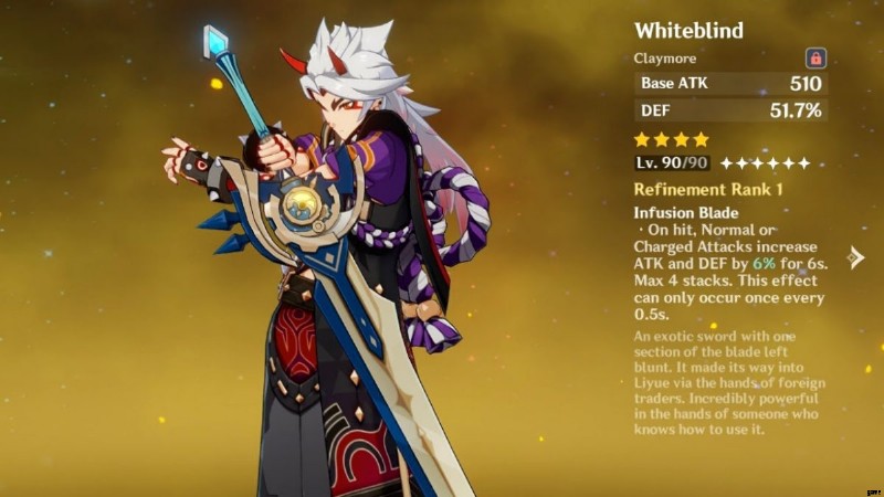 If you’re not filthy rich, then the Whiteblind weapon is the better choice. It’s craftable and also boosts your defense through the secondary stat. Moreover, both normal and charged attacks strengthen your attack and defense.