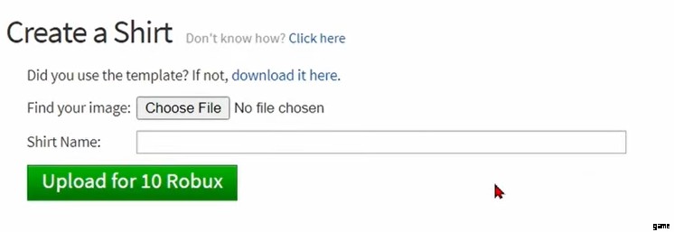 ステップ 3. 次の画面で、既存のシャツのデザインをアップロードするよう求められます。それ以外の場合は、提供されているテンプレートに基づいて新しいデザインを作成できます。シャツをアップロードすると、さらに 10 Robux が消費されます。