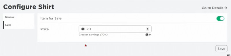 ステップ 6. 同じ画面で、シャツを販売する Robux の金額を設定し、[保存] をクリックします。販売されたアイテムごとに、Roblox が 30% のカットを取得する間、金額の 70% を取得します。