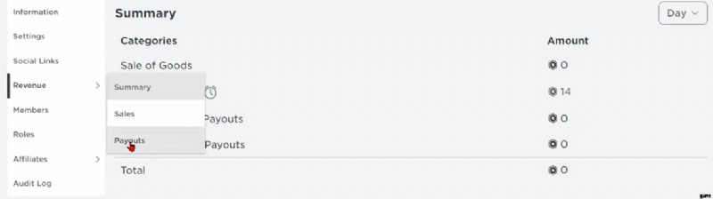 ステップ 8. 資金の保留が解除されたら、グループに戻り、グループ名の横にある 3 つの点をクリックして、[グループの構成] を選択します。 . 収益の下 、支払いを選択します そしてワンタイムペイアウト .複数の支払い受取人を追加することができ、Robux はそれらの間で均等に分割されます。