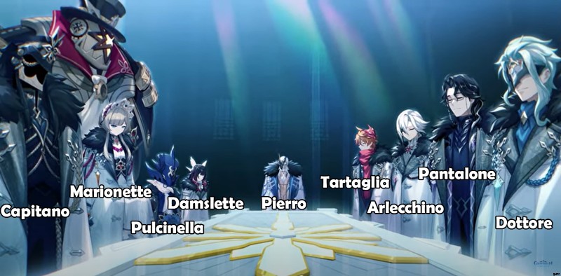 8 人の新しい Fatui Harbinger には、それぞれ独自の対話とデザインがあり、その真の個性をほのめかしています。ピエロまたは「道化師」は厳格な男であり、皮肉なことに道化師のような特徴はありません。パンタロンまたは「レグレーター」はビジネスマンであり、ドットレ「ドクター」はひねくれた学者および研究者です。 Capitano “The Captain” は、Dottore に敬意を払っているようです。これは、漏洩した情報が真実である可能性を示唆しています。