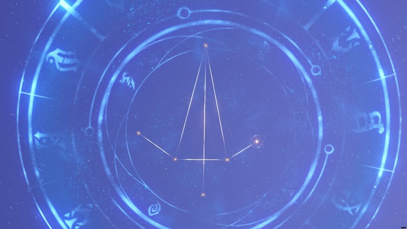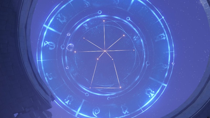 これらのスター ガイドは相互に作用することができ、それぞれが特定の方向を指しているため、配置が簡単です。最初のパズルの手がかりを得るには、プレイヤーはパズルの真上にある星空をまっすぐ見上げ、スターガイドを叩いて同じパターンを作ることでパターンを反映する必要があります.この最初の形状は巨大な剣またはクレイモアに似ており、1 本の線が中央を通り、他の線がその周りに形成されており、あたかも武器の刃、柄、およびガードを形成しているかのようです。