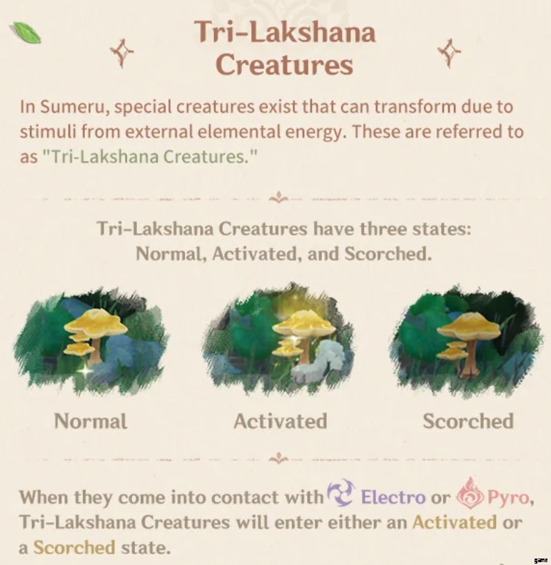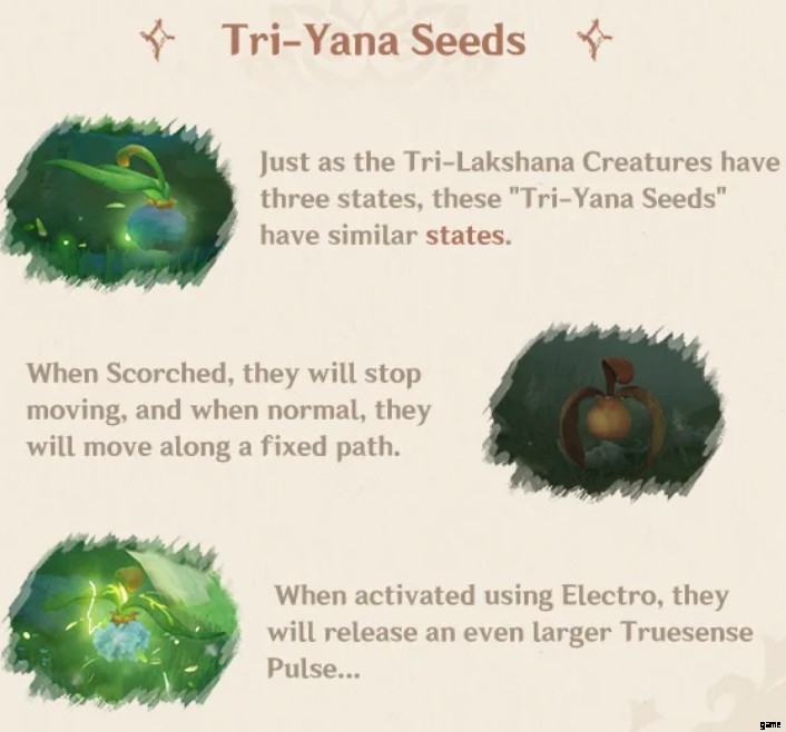 これらは、ノーマル、スコーチ、アクティベートの 3 つの状態を持つという点で、トリ ラクシャナ クリーチャーに似ています。種は浮遊しているように見え、単なる植物ではなく生き物であるという印象を与えます。彼らの動きのメカニズムは、これらがこの地域でパズルを解くために使用されることを示唆しています.
