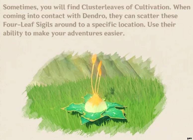 Clusterleaves of Cultivation は特別な Dendro の花で、これらのシジルを持ち、Dendro エレメントと接触すると特定の場所に広がります。これらの Clusterleaves は土地全体に散らばっており、プレイヤーは冒険中にその能力を使用して、旅行や探索を容易にすることができます。