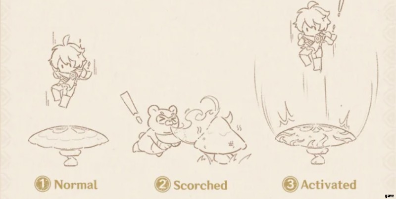 これらはすでに多数の Sumeru プレビュー、予告編、およびティーザーで見られました。これらの特別な巨大キノコは、デンドロと反応する要素と反応して、オーバーワールドで特殊効果を生み出すことができます.スコーチ、ノーマル、アクティベートの 3 つの形態があります。データブックには、パイロとエレクトロの両方を使用してこれらの特別なプラントをアクティブにできると書かれていますが、予告編によると、このメカニズムを便利に使用できるのはエレクトロのキャラクターだけです。エレクトロを使用してアクティブにすると、キャラクターが跳ね返って高くジャンプすることができます。通常の状態では、適度な高さのジャンプに使用して、崖や端を乗り越えることができます.