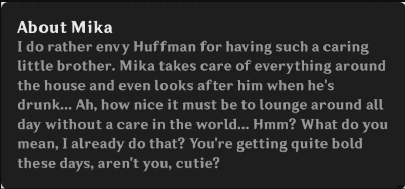 このことから、ミカにはハフマンという名前の兄がいることがわかります。彼はプレイヤーがまだ会ったことのないキャラクターですが、将来彼らが会う可能性があります.リサの性格通り、ミカのような頼りになる兄が周りに家事をすべてこなし、酔っ払った弟の世話までしてくれるなんて、なんて便利なんだろうと彼女はうらやましく思います。