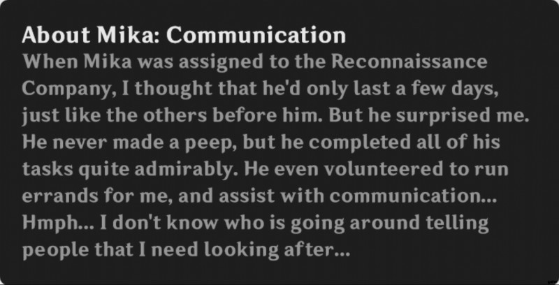 ユーラによると、彼女はミカが偵察中隊で長続きしないだろうと考えており、彼の役割は要求の厳しいものであり、彼はそれに追いつくのに十分な強さを持っている.彼はまた、用事を実行し、ユーラと彼女の会社のコミュニケーションを支援するために志願したときにも非常に役に立ちました.末尾の 3 つのドットは、Eula が Mika についての別の音声ラインを持っていることを示唆しています。