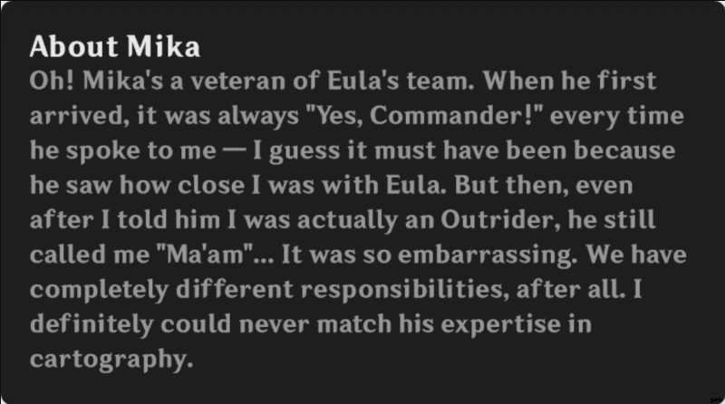 このことから、ミカがどれだけ親切で敬意を払っているかがわかります。これはまた、Eula のチームにおける彼の役割が、地図を作成して新しい地形を調査する地図作成者であることを明らかにしています。また、彼が Eula をどれだけ尊敬しているかを示しています。