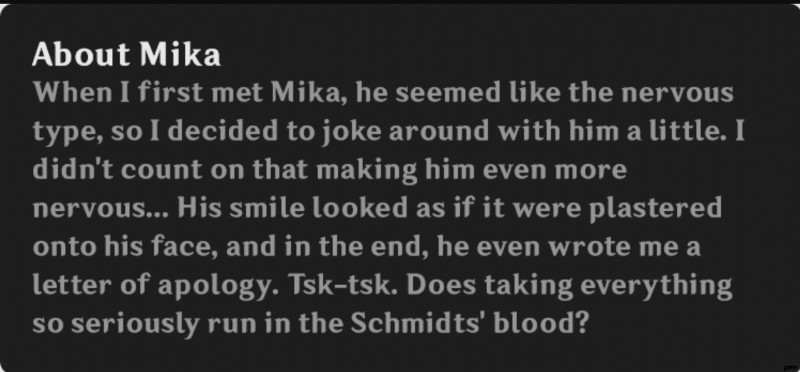かえやはいつものようにいたずら好きで、ミカを怖がらせたようです。彼はこのボイスラインで神経質なタイプであることが明らかになりました.また、彼の姓であるシュミットについても知ることができます。緊張しているにも関わらず、ミカはまだ笑顔を見せていました。これは、彼が精神的に優れていることを意味している可能性もあります.