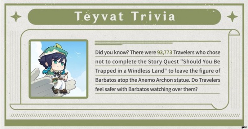新聞は、トラベラーがバルバトスに見守られている方が安全だと感じたため、上記のクエストを完了しなかったと言っていますが、私たちは同意しません.たぶん、トラベラーはヴェンティをアルコールから遠ざけ、アルコーンとしての仕事をしたかっただけなのかもしれません。とにかく、誰もがこれを愛らしいと思うと確信しています。クエスト「風のない国に閉じ込められるべきか」はヴェンティの過去にとって重要であり、満足のいく結末を迎えますが、彼は自分の像の上に座るのが適切で運命づけられていると感じています.