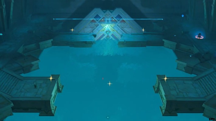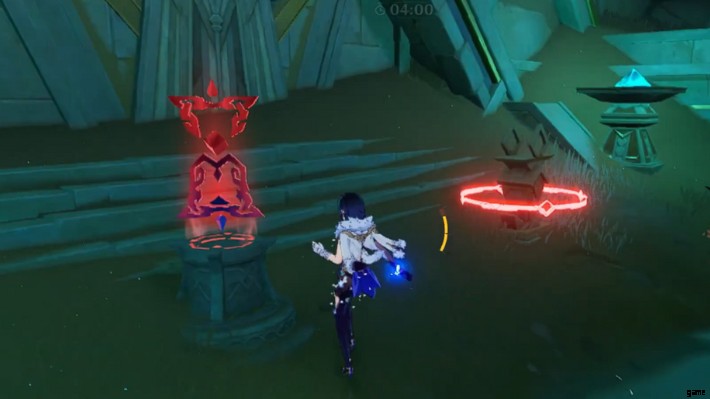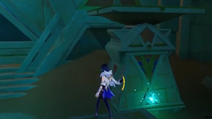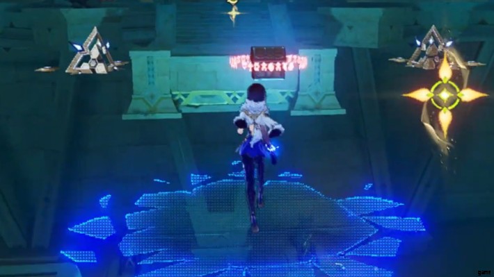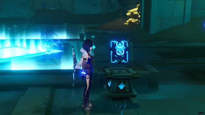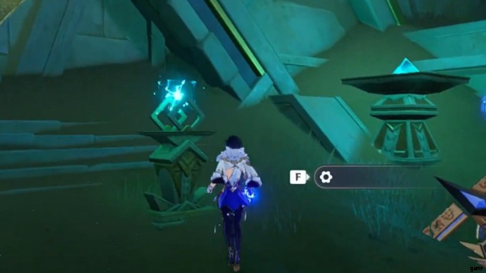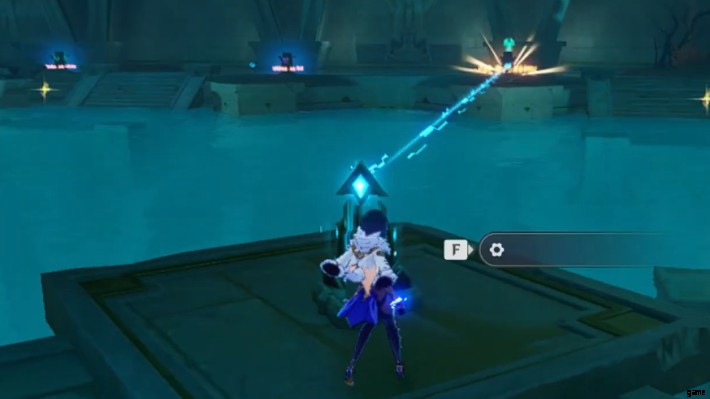そこに配置したら、セルを保持している台座に向かいます。隙間の向こう側の台座をよく見ると、Hydro、Anemo、Electro の 3 つのシンボルに気付くでしょう。レーザービームが当たると、各台座は異なる機能を果たします。水位を下げるには、反対側のハイドロ ピラーを照らすように、自分の側のセルをそれぞれの台座に移動する必要があります。アネモの柱にビームを当てると、ターボ ウィンド リングが現れ、エレクトロの場合は、目に見えない壁と床がアクティブになり、チェストが生成されます。