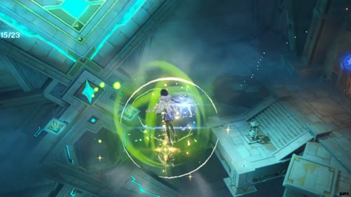 すべてが整ったので、下の階の最も遠いエリアに向かい、赤く光る柱をアクティブにします.これにより、すべての粒子を収集する必要があるミニチャレンジが開始されます。風の流れと四つ葉の印章に従って、それらをすべて集めてください。