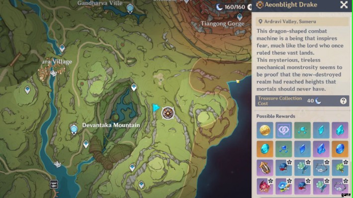 パーペチュアル キャリバー アセンション マテリアルを入手するには、イオンブライト ドレイクを倒す必要があります。このモンスターはレベル 30 以上のボスで、Sumeru の Rainforest エリアで見つけることができます。 Aeonblight Drake は Devantaka Mountain の近くの洞窟にあります。ここにたどり着くには、デバンタカ山の北にあるテレポート ウェイポイントを使用し、東に向かいます。以下はその場所の地図です。