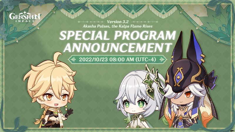 バージョン 3.2 の特別番組は、2022 年 10 月 23 日に Twitch で生放送されます .プレーヤーは 午前 8 時 (UTC-4) にライブで視聴できます Genshin Impact Twitch公式チャンネルで指定された日に。