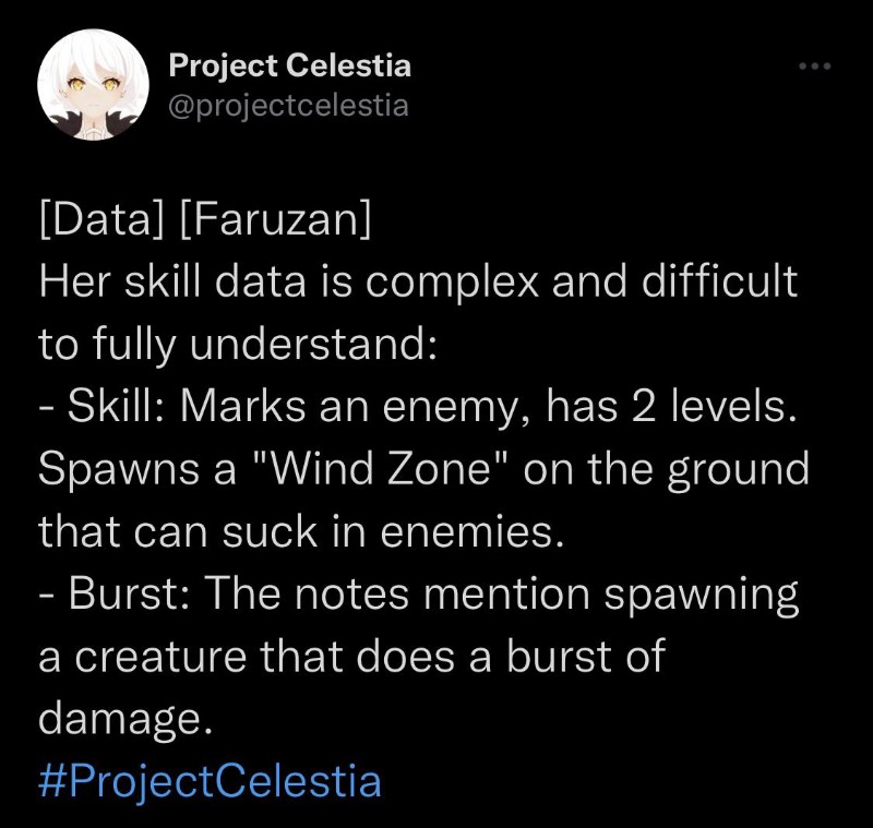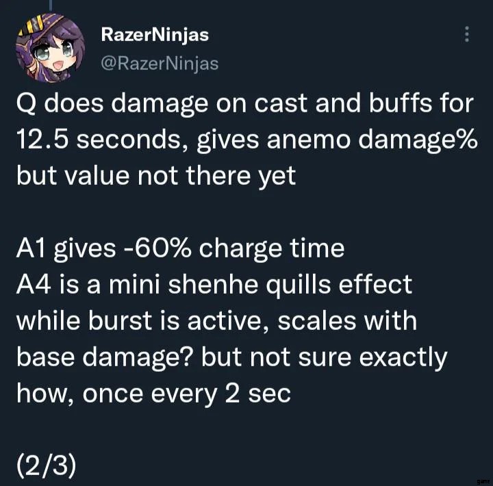彼女の Q は、キャストするとかなりのダメージを与えると言われ、12.5 秒間あなたのパーティーをバフします。最初のキャストのアネモ DMG 値は言及されていません。このリークは、特に「クリーチャー」について言及していません。