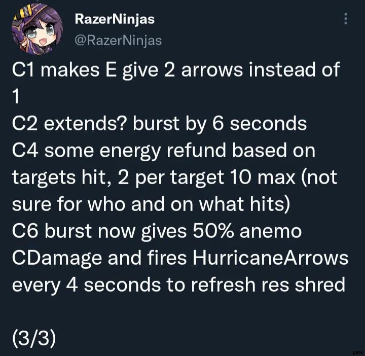 彼女の星座に関しては、彼女の C1 は彼女に 2 つの矢を与えます。これはここでは 2 つのハリケーン アローを意味する可能性があります。彼女の C2 はバーストの持続時間を延長します。これは、より多くのダメージを与えるか、チームメイトに与えるバフの持続時間を長くすることを意味します。