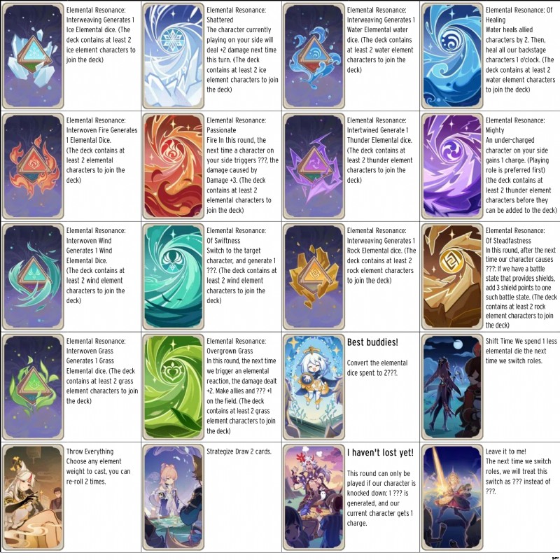 上記のカードは、エレメンタル レゾナンスと一部のキャラクター カードを示しています。奇妙なことに、彼らは必ずしもスキルやバーストを参照しているわけではなく、さわやかな詳細であるキャラクター自体を参照しています.