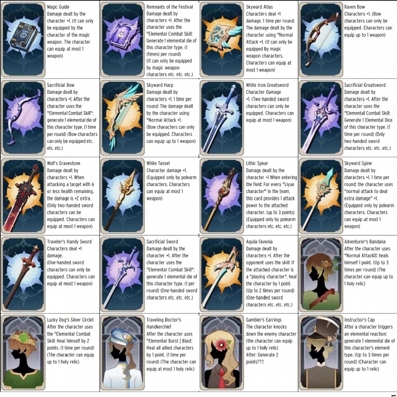 上記のゲーム カードは、ゲーム内の武器の一部です。 3つ星、4つ星、さらには5つ星の武器カードがあり、それらの一般的な説明によれば、それらはその武器タイプのキャラクターに対して、または一緒に使用できます.