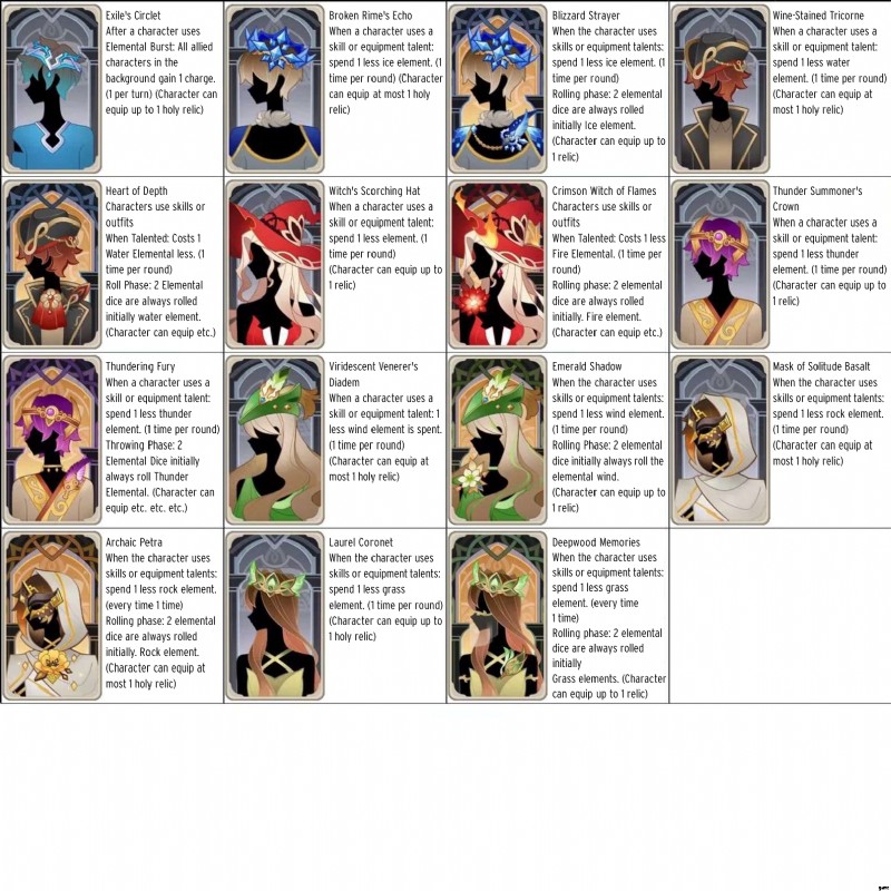 これらのキャラクターカードは、私たちにとってまだ謎です。彼らはそれぞれの国の NPC のように見え、それぞれの地域の兜アーティファクトで描かれているように、王冠または兜を身に着けています。それらの効果は、それぞれのアーティファクトの性質と要素を反映しているようです.