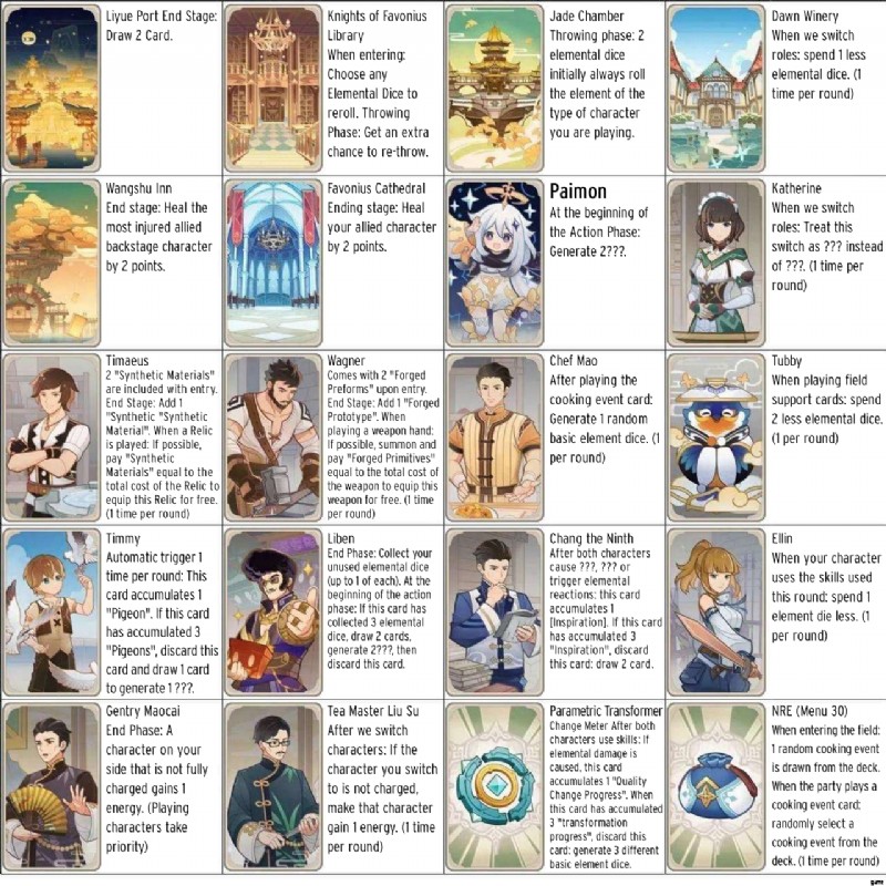 この最後のキャラクター カードのセットでは、いくつかの NPC、場所、およびガジェットを紹介します。セレニテア ポットからは、エリン、リベン、ワグナー、ティミー、パイモン、さらにはタビーなどのキャラクターを見ることができます。