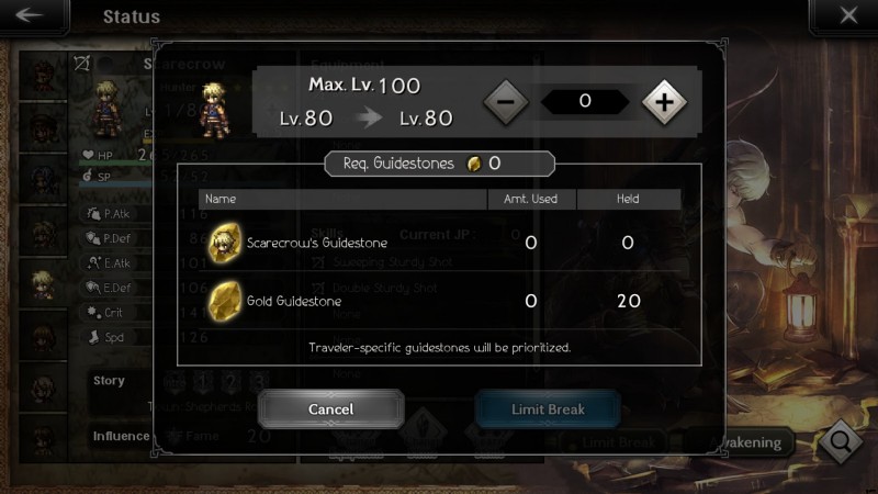 レア度の高いトラベラーはレア度の低いユニットよりも有用であると想定するのは簡単ですが、これはすべての戦いに当てはまるわけではありません.星のレア度が低いキャラクターほどレベル上限が低いのは事実ですが、これは限界突破システムを通じてガイドストーンを消費することで回避できます。これにより、トラベラーのレベル上限が上がります!一部のトラベラーは、最大レアリティよりも低いレアリティで入手することもできますが、グラインドするか、ガチャからレアリティの高いバージョンを入手することで昇格できます。