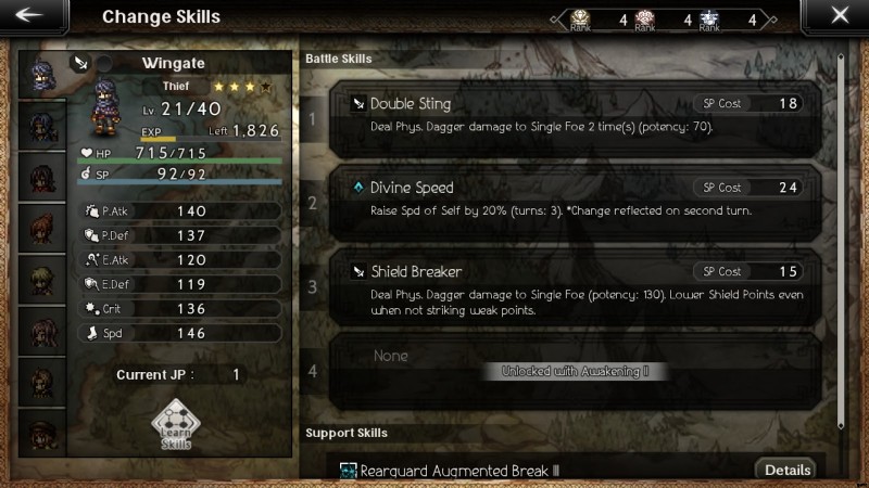 トラベラーのスキルセットも、戦闘での有用性に影響を与える可能性があります。たとえば、ウィンゲートは現在 3 つ星/4 つ星のトラベラーですが、彼のシールド ブレイカー スキルにより、敵の弱点を攻撃していなくても、敵のシールド ポイントを 1 減少させることができます。トラベラーの多様な名簿が不足している可能性のあるゲーム初期のプレイヤーにとって、非常に便利なスキルです。