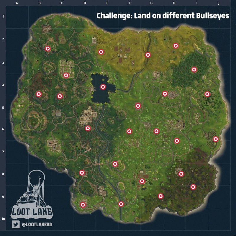 これは、私たちがまだ見たことのない新しいスタイルの挑戦です。バスから飛び降りると実際にこれらを見ることができますが、地図上で非常に明白な赤いマーカーに着陸する必要があります.発射台を取得すると、それを使用して指定されたエリアに着陸することができ、それが着陸としてカウントされます。これは @LootLakeBR の Twitter からの地図で、すべての場所が表示されています!