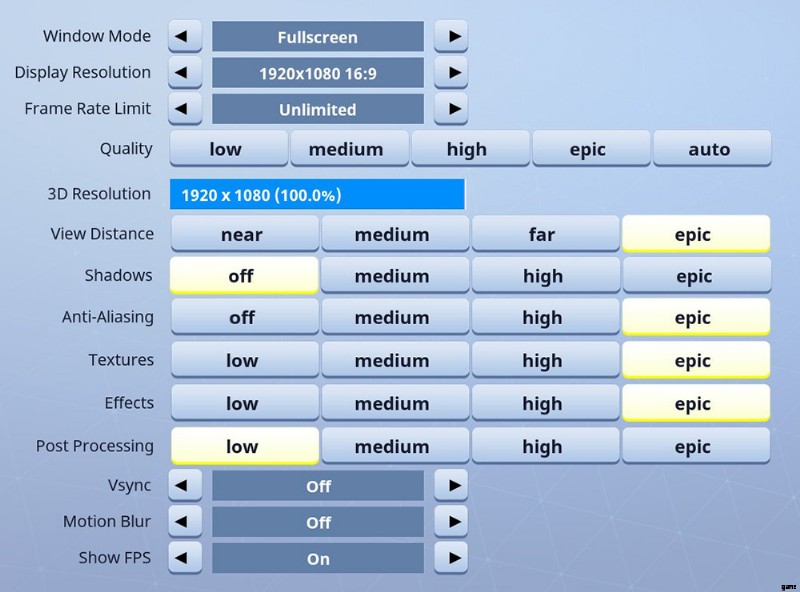 Myth's Fortnite ビデオ設定