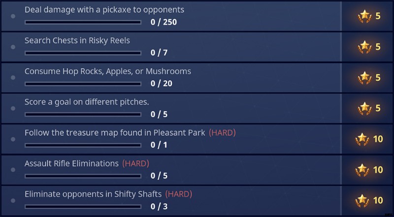 チャレンジの第 7 週のシーズン 4 バトルパスで何をしているのか見てみましょう!つるはしで人々にダメージを与えたり、Risky Reels でチェストを開けたり、採集したアイテムを消費したり、さまざまなピッチでゴールを決めたり、ライフルで攻撃したり、Shifty Shafts で敵を排除したりしているようです!