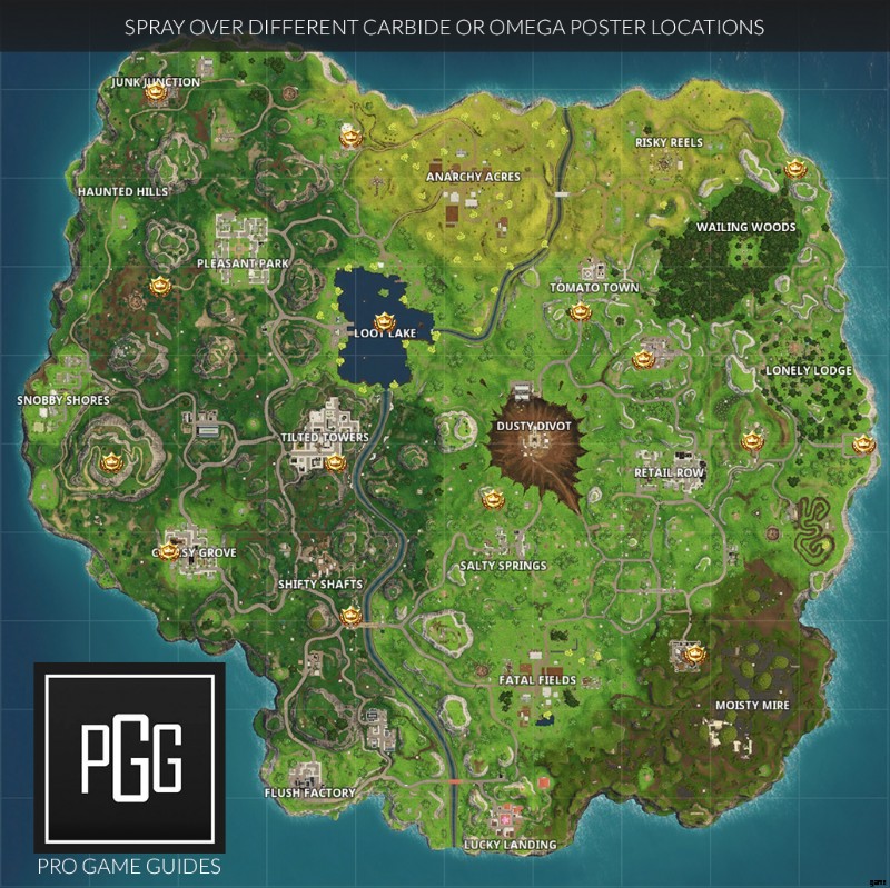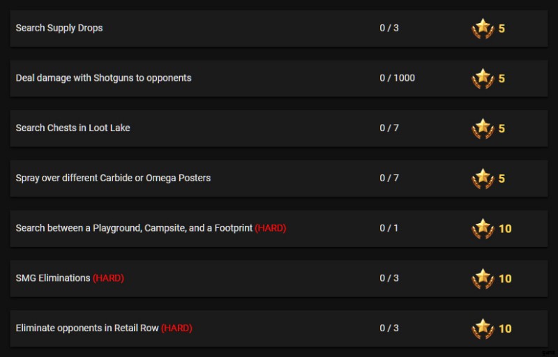 Fortniteのバトルパスのシーズン4の第6週の課題の時間です.今回は補給物資を探し、ショットガンでダメージを与え、戦利品の湖でチェストを開き、カーバイドまたはオメガのポスターにスプレーし、遊び場、キャンプ場、足跡の間で宝物を探し、smg を排除し、最後に敵を排除します小売列!
