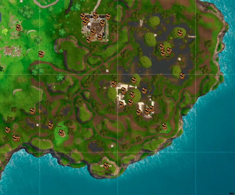 Moisty はかなり不人気な着陸スポットですが、映画セット エリアはチェストの絶好のスポットです。北東にある大きな木にぶつかることもできます。通常、その周りに少なくともいくつかのチェストがあります。北東の刑務所エリアは、この課題にはカウントされない可能性が非常に高い.下のモイスティ・マイアのチェストの完全なマップをチェックしてください!