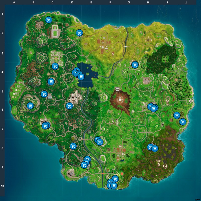 ショッピング カートをつかみ、押し始めて、このチャレンジのクレジットを獲得します。 fortnitechests.info のおかげで、下の地図でショッピング カートがある可能性のあるすべてのエリアを見つけることができます!