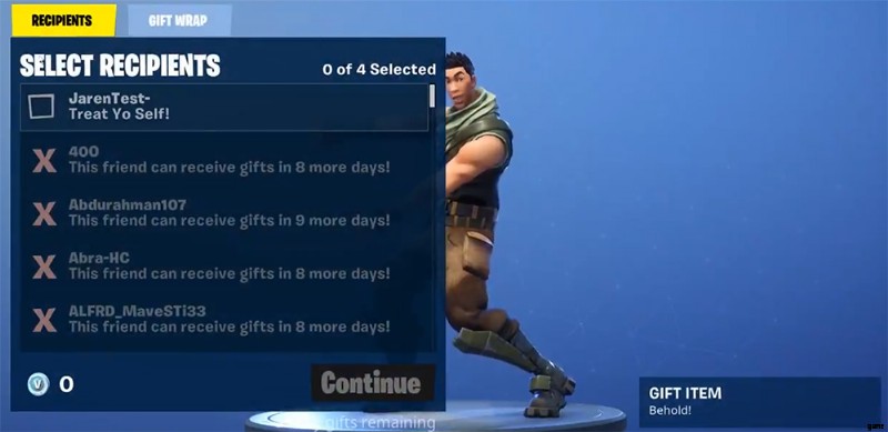 ここには見るべきものがたくさんあります。まず、一度に最大 4 人 (自分用を含む) にギフトを贈ることができます。一定数のギフトのみを受け取ることができるようです。その上限に達した場合、さらに受け取るには少なくとも 9 日間待つ必要があります。このメニューのすぐ下に読みにくいテキストもありますが、それは残りのギフトの量です. 「残り 5 デイリー ギフト」と表示されているため、1 日 5 スキンまでしかギフトを贈ることができません。これがスキンごとなのか、レシピエントごとなのかは不明です。商品を贈りたい相手を選択したら、ギフト包装メニューに移動します。