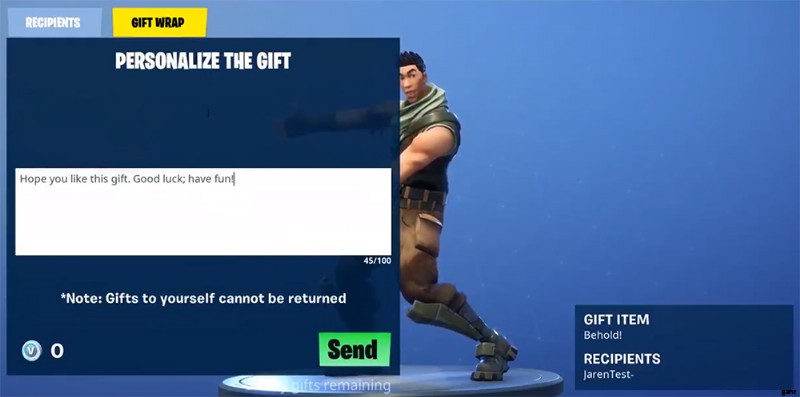 ここでは、ギフトをパーソナライズして、友達にメッセージなどを残すことができます。このメニューで注意すべきことは、ギフトを自分に返すことができないということです。ただし、他の人に贈った贈り物を返してはいけないというわけではありません。したがって、贈り物を後悔している場合は、それらの V-Bucks の一部を取り戻すことができるかもしれません.