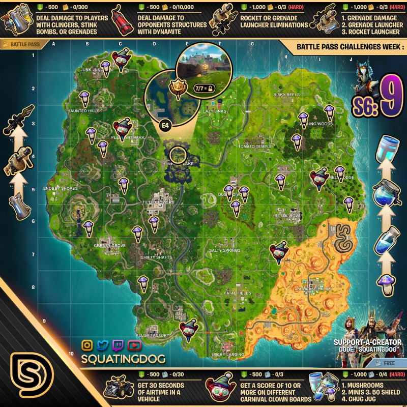 フォートナイト シーズン 6 ウィーク 9 チャレンジ リスト、チート シート、場所と解決策