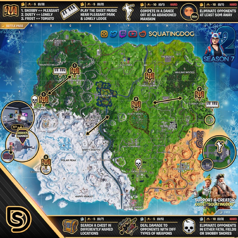 今週は、さまざまな名前の場所でチェストを検索し、さまざまな武器タイプで対戦相手にダメージを与え、Snobby Shores または Fatal Fields で対戦相手を排除し、名前付きエリアを訪れ、ピアノで楽譜を演奏し、放棄された邸宅でダンスを競い合い、排除します離れた相手!