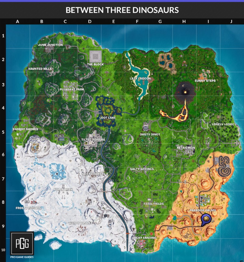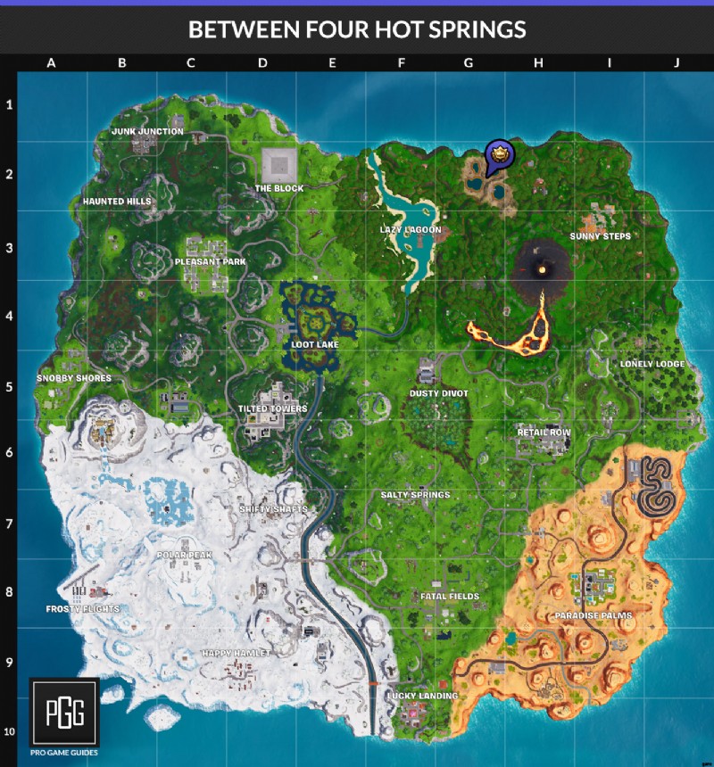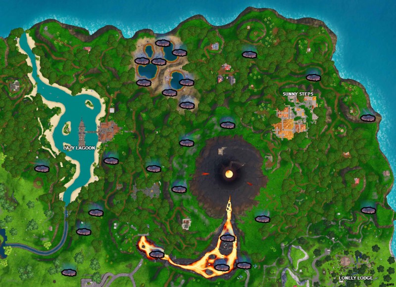 マップの温泉プール エリアには、これらが集中しています。レイジー ラグーンのすぐ北東にあるので、このチャレンジを最も簡単に完了するには、そこに向かいましょう!最初に「x オブジェクト間のダンス」チャレンジを行うことをお勧めします。これにより、そのチャレンジの 3 番目のステップとして言及した温泉に移動できます。下の地図は、Lootlake.info のおかげで、いくつかの火山噴出口の場所を示しています。