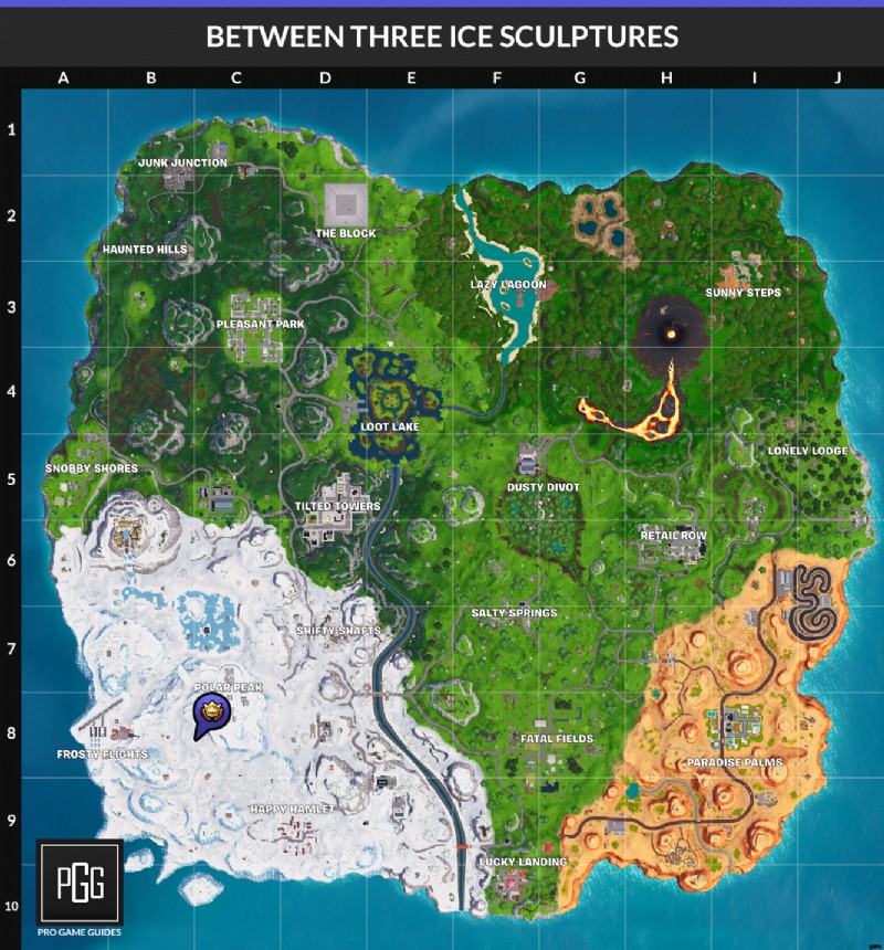 これは、マップ上のさまざまなオブジェクトの間で踊る 3 ステップのチャレンジです。お気に入りの選択に必ずダンスを入れて、必要なオブジェクトの真ん中で使用してください。最初に踊るのは、ポーラー ピークの南西にある氷の彫刻の間です!