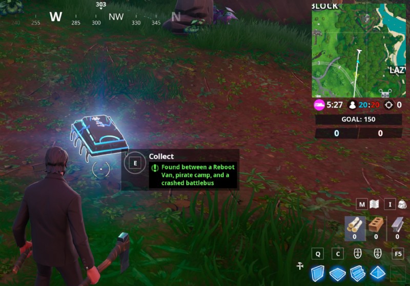 手がかりは「リブートバン、海賊キャンプ、墜落したバトルバスの間にある」。しばらくプレイしていれば、レイジー ラグーン近くのアンブレラ エリアの南にバトルバスが墜落したことを覚えているはずです。そのエリアの近くにはまだ海賊キャンプがあり、リブート バンも近くにあります。
