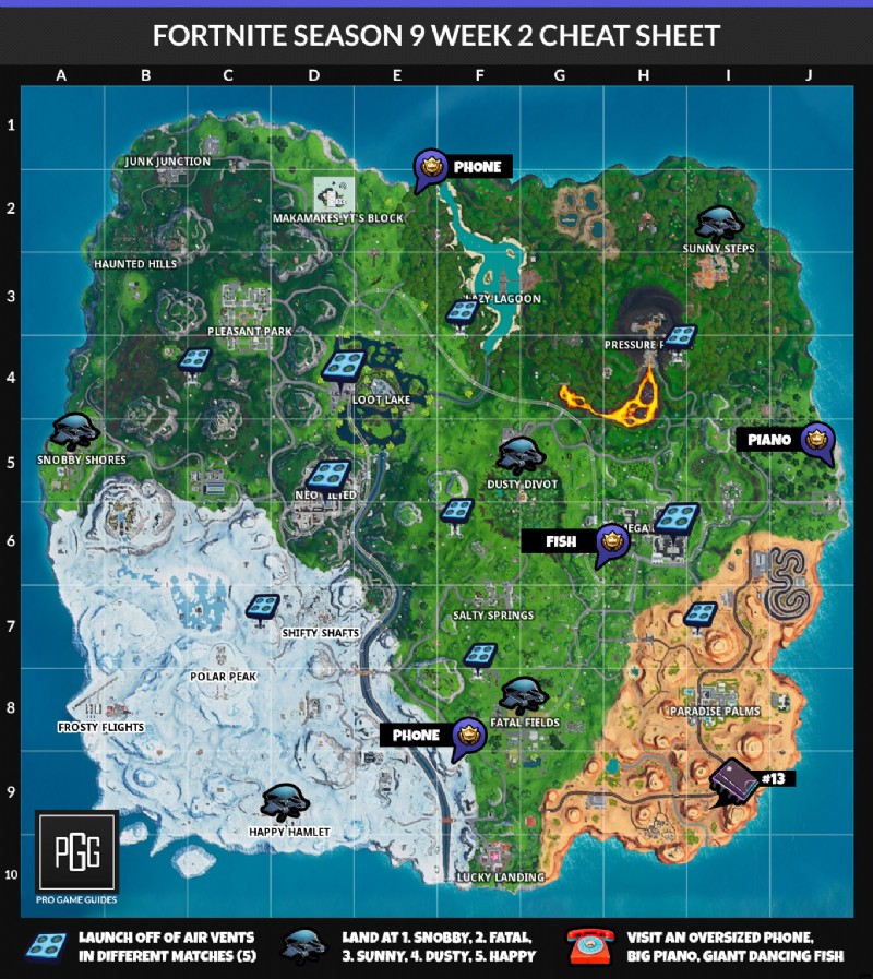 フォートナイト シーズン 9 ウィーク 2 チャレンジ リスト、チート シート、場所と解決策