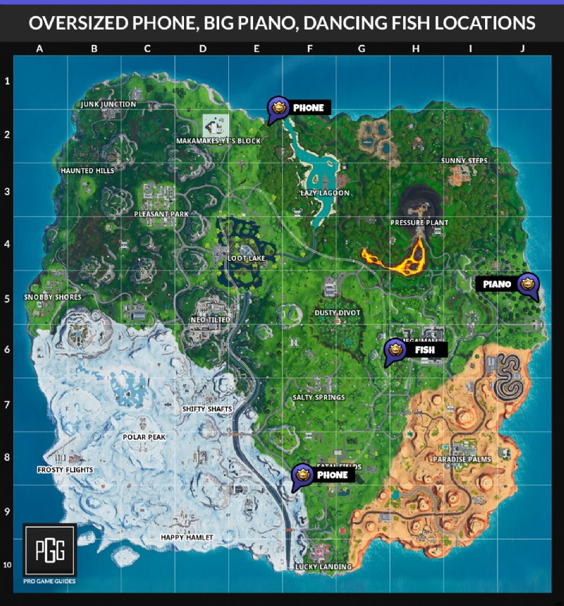 今週は、通気孔から発射し、マップのさまざまな場所に着陸し、Sunny Steps または Shifty Shafts で敵を排除し、ピストルで敵にダメージを与え、特大の電話、大きなピアノ、巨大な Dancing Fish トロフィーを訪れます。 1 回の試合でさまざまな名前の場所にあるチェストを検索し、少なくとも 50m、75m、100m 離れた場所から対戦相手を排除します!